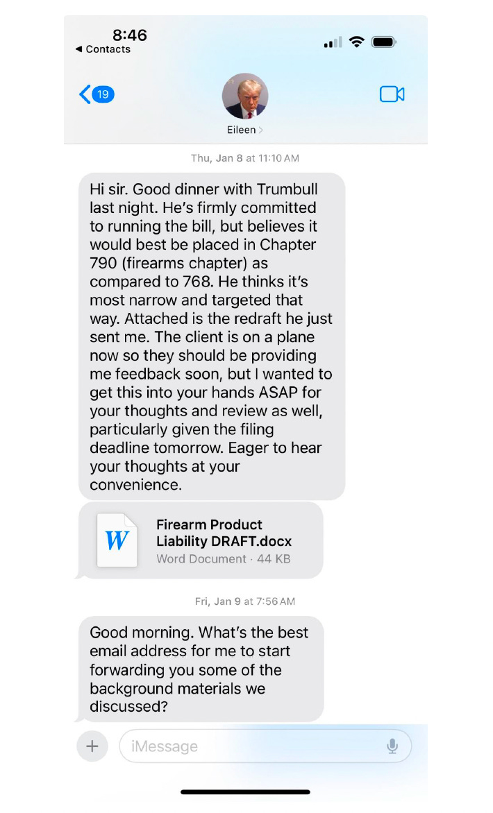 Another text message obtained by Seeking Rents — sent by Eileen Stuart, a lobbyist for Sig Sauer, to Duggan, the House bill sponsor — shows that Sig Sauer representatives dined with Trumbull shortly before the session began. The lobbyist described the future Senate president as “firmly committed” to the legislation.