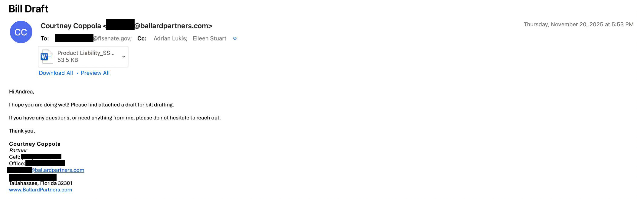 Emails and text messages obtained by Seeking Rents show lobbyists for Sig Sauer gave the original draft of the legislation to Trumbull and Rep. Wyman Duggan (R-Jacksonville), who received a $50,000 donation from the company in December.