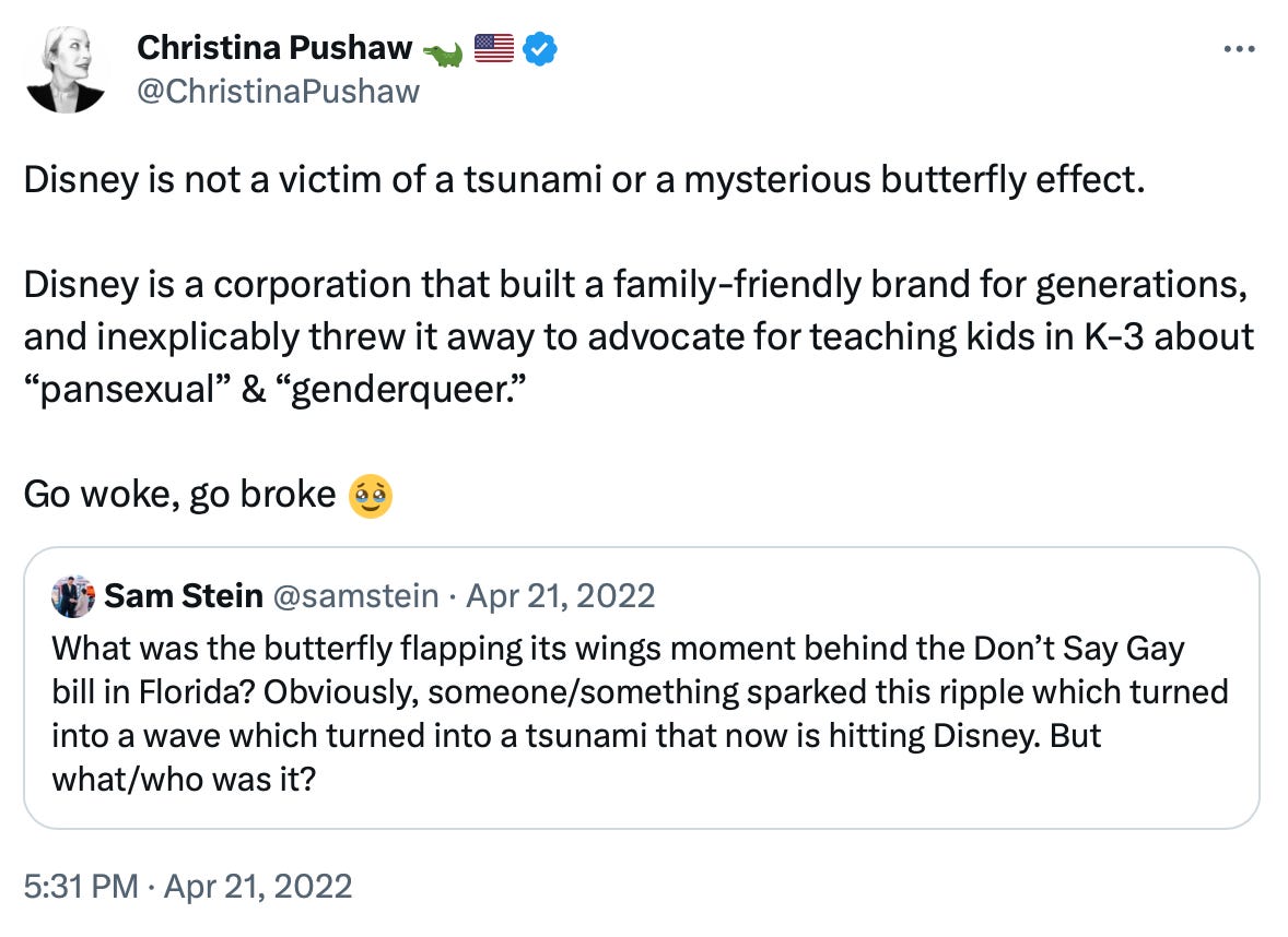 And when a major employer — the Walt Disney Co. — bent to pressure from its own employees and spoke out against just one of those new laws, DeSantis retaliated by having the Legislature pass a bill giving him control of the government district that oversees Walt Disney World’s property in central Florida. “Go woke, go broke,” DeSantis’ official spokesperson boasted.