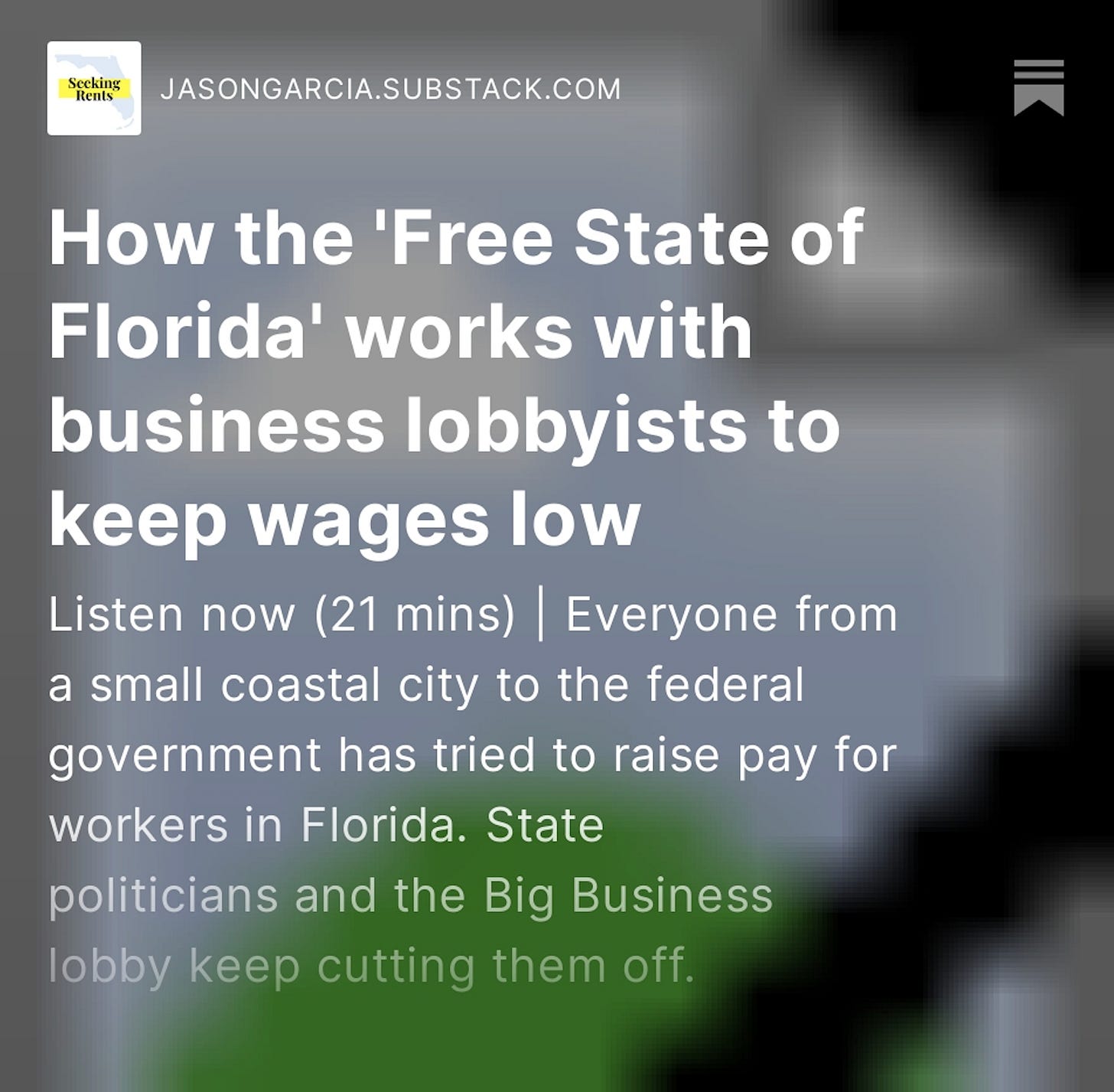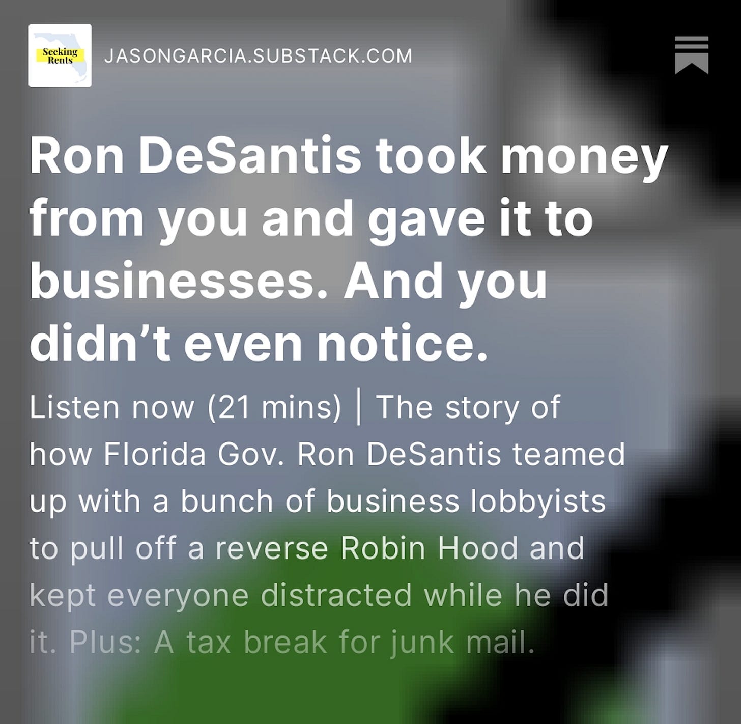 This is Seeking Rents, a newsletter and podcast devoted to producing original journalism — and lifting up the journalism of others — that examines the many ways that businesses influence public policy across Florida, written by Jason Garcia. Seeking Rents is free to all. But please consider a voluntary paid subscription, if you can afford one, to help support our work.