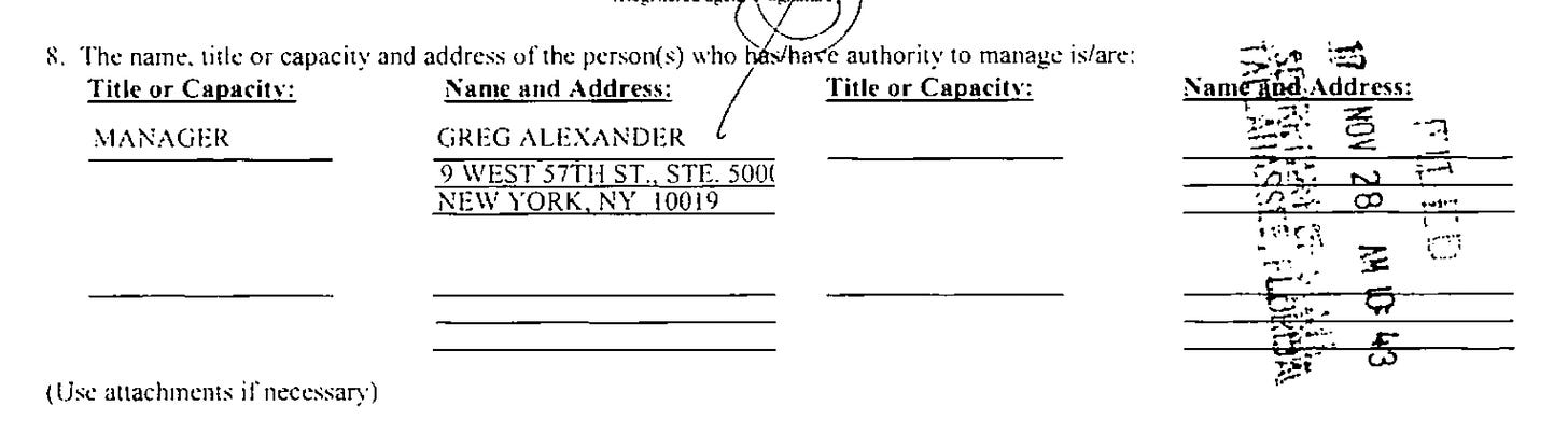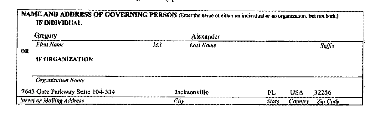 Specifically, corporate registration documents in Texas identify Gregory Alexander as a “governing person” for the entity.
