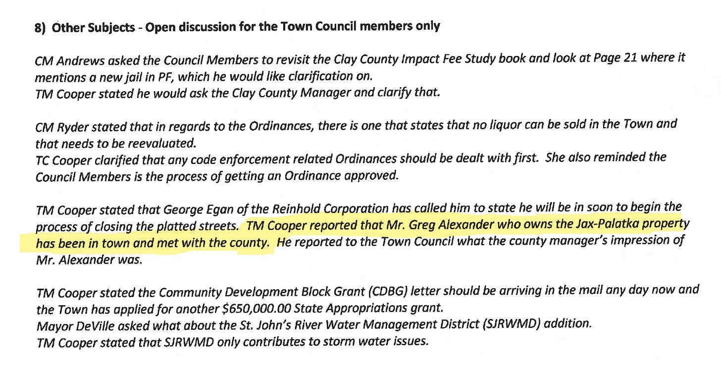 And the minutes from a 2023 meeting of the Town Council in Penney Farms identify a “Mr. Greg Alexander” as the owner of all the property purchased in Clay County by Jax-Palatka Farms LLC. Once again, additional Ruane Cunniff names and addresses appear in other Jax-Palatka records, as well.