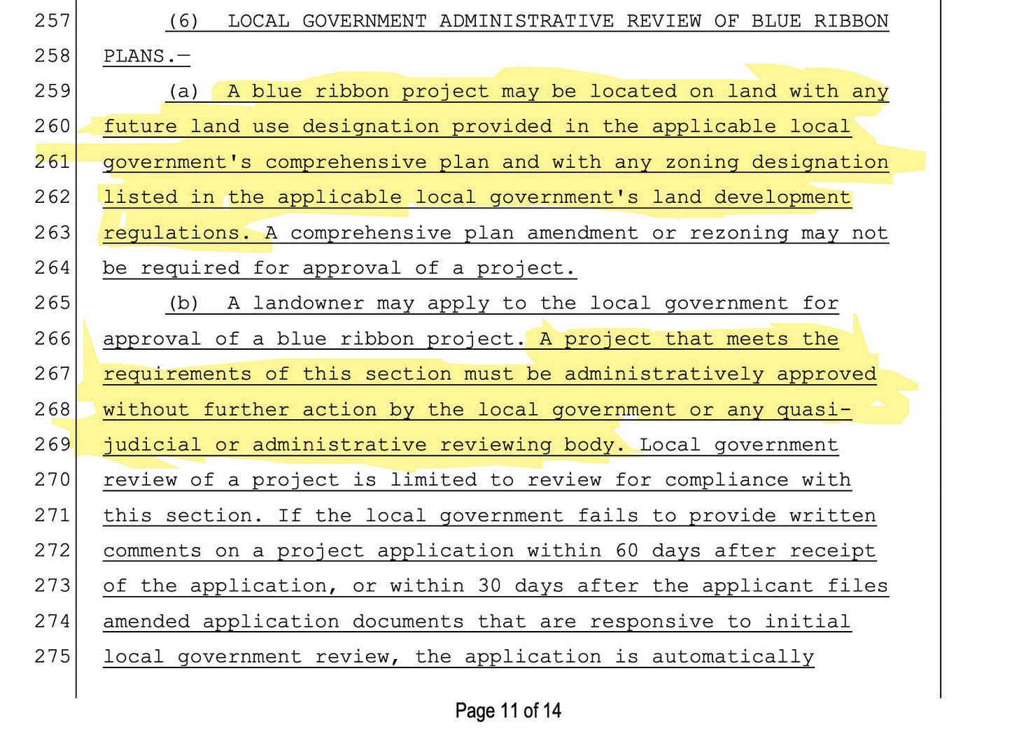 A proposed development meeting the criteria would be classified as a “blue ribbon project.” And the local government in the area would then be forced to allow high-intensity development on the remainder of the property — regardless of the current zoning or future land use.