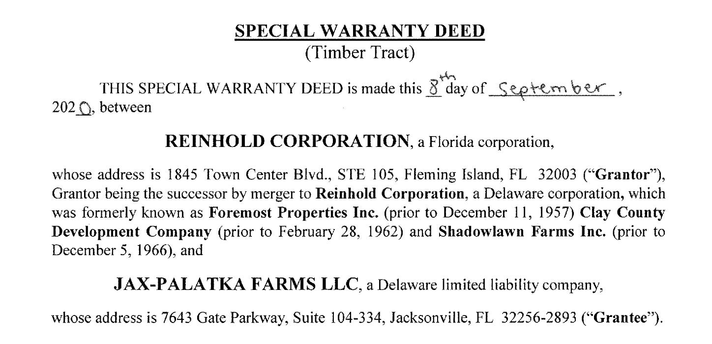 And in September 2020, yet another entity — called “Jax-Palatka Farms LLC” — paid a little more than $36 million to buy several large tracts in Clay County from the Reinhold Corp., a family-owned firm that began as a dairy cattle and timber operation and today is the largest private landowner in Clay County.