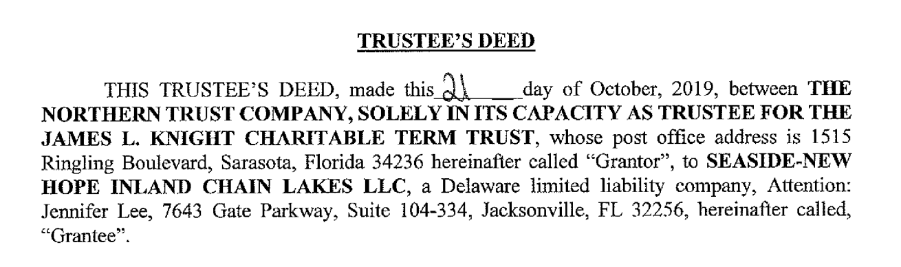 In October 2019, for instance, an entity called “Seaside-New Hope Inland Chain Lakes LLC” and four other similarly-named entities paid a combined $54 million to buy five giant parcels of land in Washington County from a charitable trust established in the name of James L. Knight, the former newspaper publisher who founded the now-defunct Knight Ridder chain.