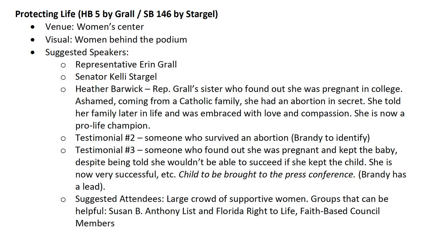 In an early planning memo near the end of last year’s legislative session, DeSantis’ aides made clear that they wanted the governor surrounded by women when he signed a law outlawing virtually all abortions after 15 weeks — even for victims of rape, incest or human trafficking.