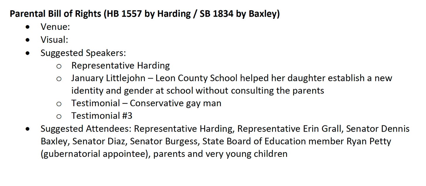 For “suggested speakers,” they wanted a testimonial from a “Conservative gay man.” And the crowd needed to include “parents and very young children.”