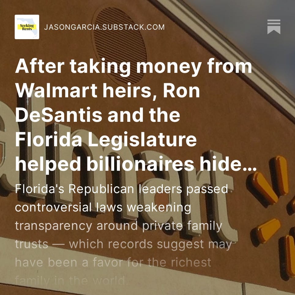 This is Seeking Rents, a newsletter and podcast devoted to producing original journalism — and lifting up the journalism of others — that examines the many ways that businesses influence public policy across Florida, written by Jason Garcia. Seeking Rents is free to all. But please consider a voluntary paid subscription, if you can afford one, to help support our work.