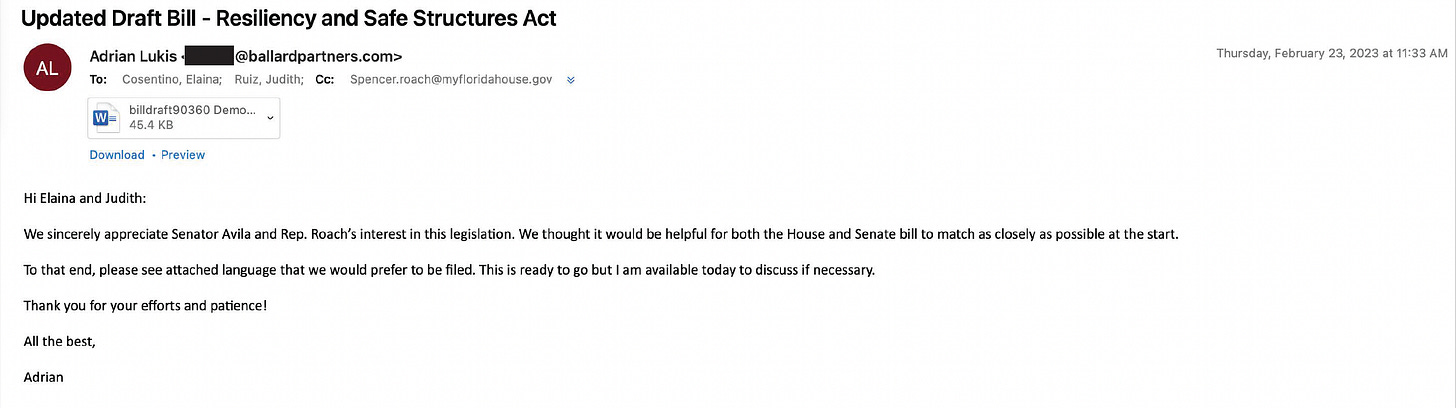 For instance, though he never testified in public, those emails and texts show that one lobbyist was largely orchestrating the legislation in private: Adrian Lukis, a former chief of staff to Gov. Ron DeSantis who jumped to a lobbying job at Ballard Partners about a month after leaving the Governor’s Office. (Ballard Partners is run by longtime Florida Republican rainmaker Brian Ballard, who is now one of DeSantis’ biggest fundraisers.)