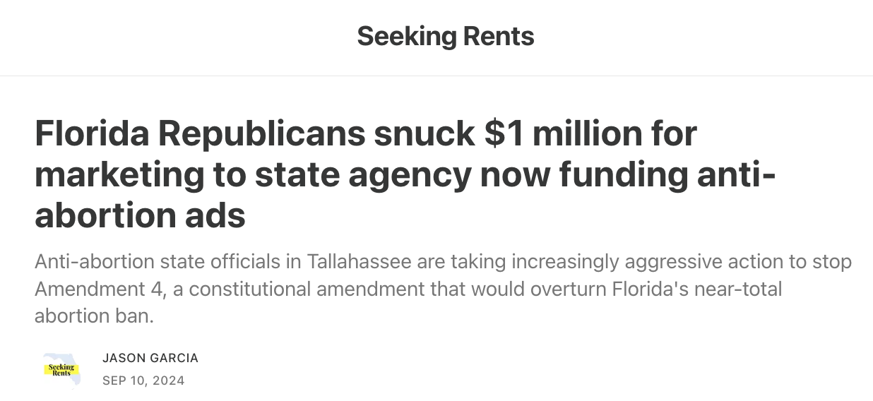 This is Seeking Rents, a newsletter and podcast devoted to producing original journalism — and lifting up the work of others — about Florida politics, with an emphasis on the ways that big businesses and other special interests influence public policy in the state. Seeking Rents is written by veteran investigative journalist Jason Garcia, and it is free to all. But please consider a voluntary paid subscription, if you can afford one, to help support our work.