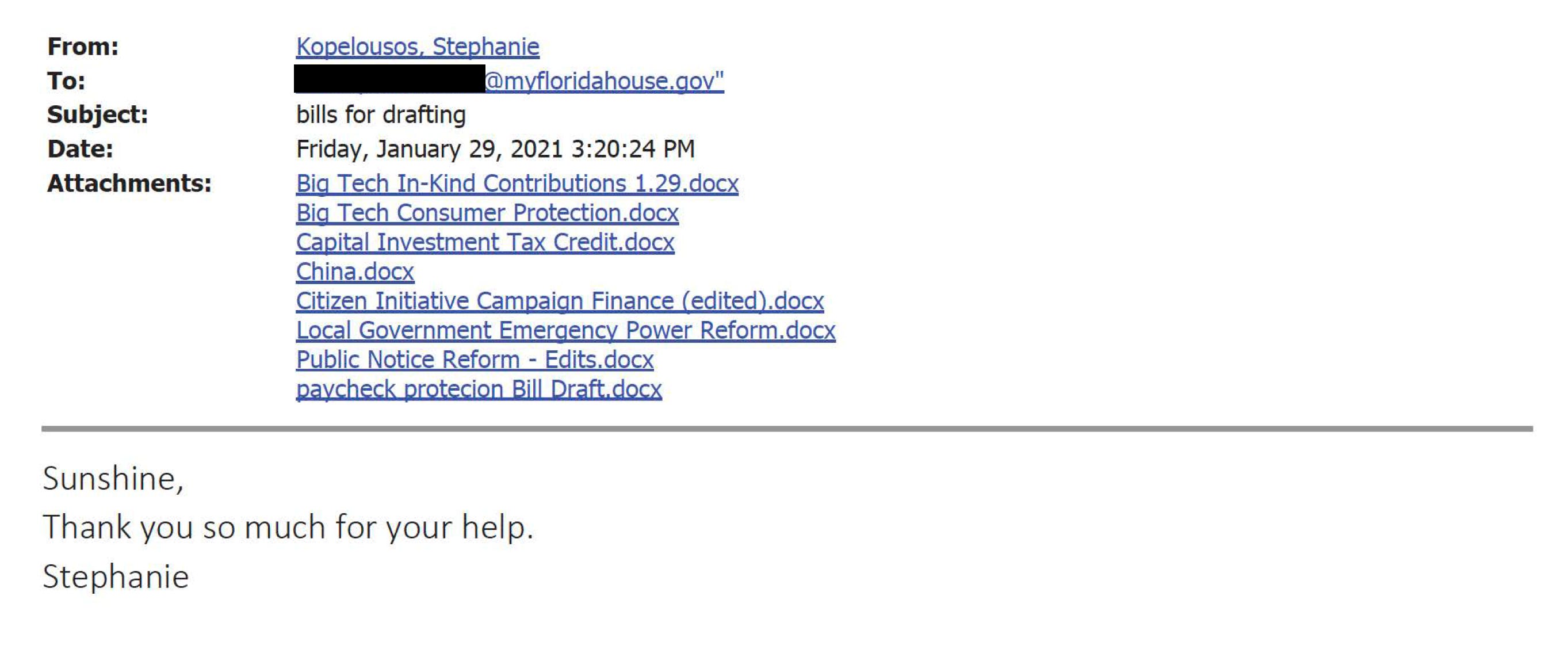 Specifically, the emails show that Stephanie Kopelousos, the governor’s legislative affairs director, sent drafts of the proposed “intellectual property” tax break to staffers in both the state House and the Senate in late January 2021. That was about two weeks before Gruters filed the bill for the third time.