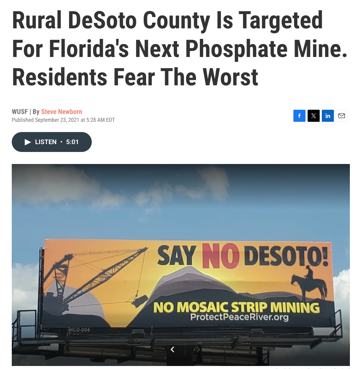 The focus on finding new ways to use or hide waste left behind by the phosphate industry comes as Mosaic tries to open its first brand new phosphate mine in Florida in decades. County commissioners in tiny DeSoto County — where Mosaic owns more than 20,000 acres — already rejected the company once in 2018 amid intense local opposition.