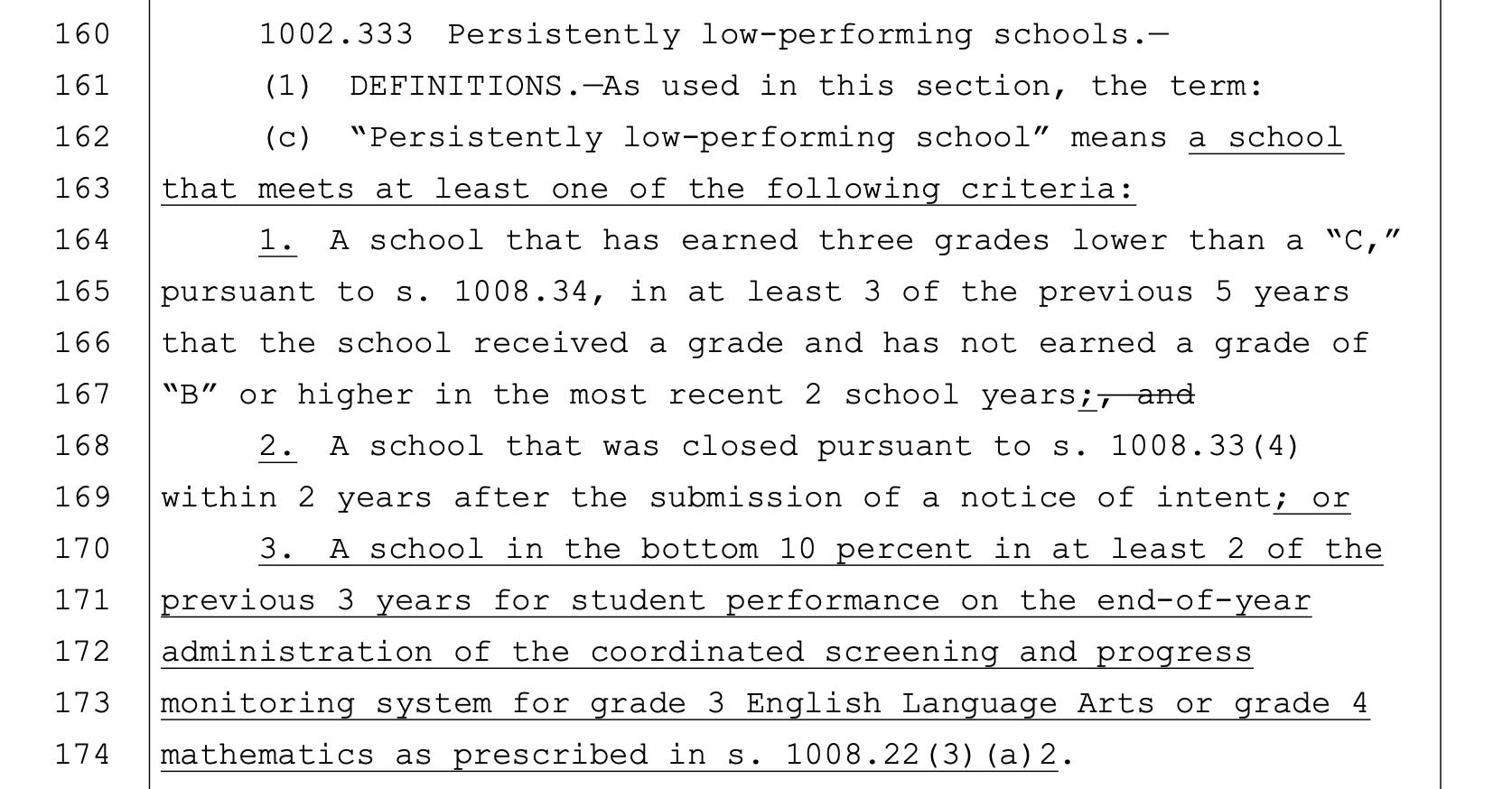But that would change under Senate Bill 2510, which would expand the legal definition of persistently low-performing schools. “The modification will greatly increase the number of schools being designated as persistently low-performing schools compared to the current 51 schools,” according to a Senate staff analysis of an early version of the legislation.