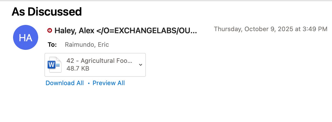Emails obtained by Seeking Rents through a public-records request show that the food libel language was inserted into the farm bill after the bulk of the legislation had already been submitted to Legislature. That suggests that it’s not some issue that simply bubbled up from Department of Agriculture and Consumers Affairs staff.