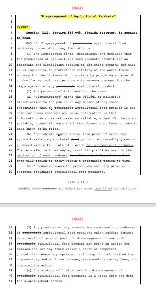 But the new farm bill would expand Florida’s food libel law well beyond apples and oranges. It would do so in two important ways.
