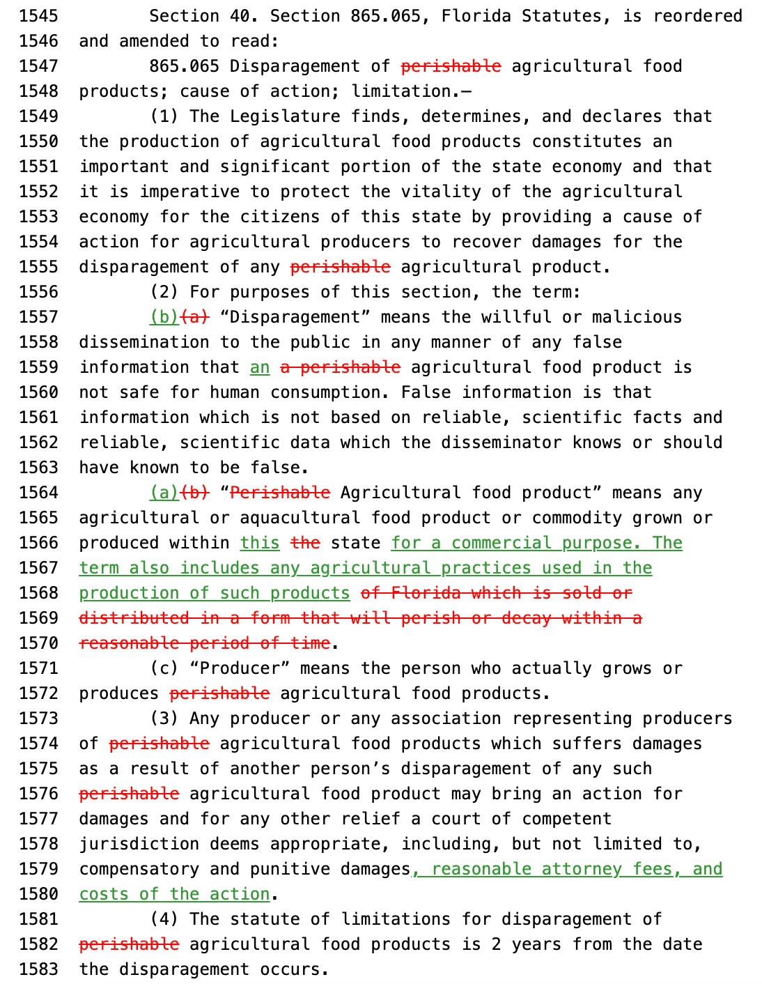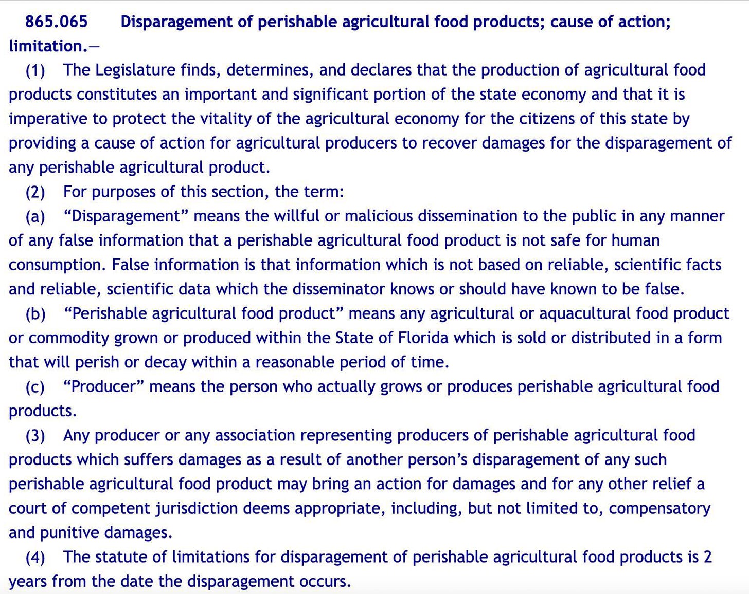 For instance, under Florida’s food libel law, an agricultural company that claims to have suffered losses due to “disparagement” by someone like a news outlet or an advocacy group does not have to prove that anyone made a false statement.