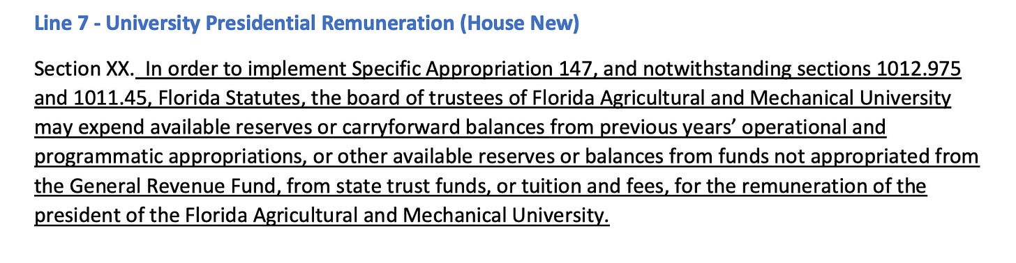 A last-minute measure would let Florida A&M University trustees spend extra public money on a nearly $900,000 pay package for the Ron DeSantis-backed telecom lobbyist picked to be school president.