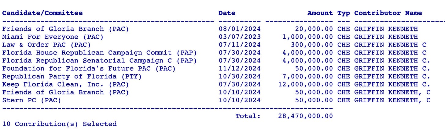 The recent Florida transplant with a roughly $50 billion net worth has rapidly become one of the most influential figures in the state. Records show Griffin made more than $28 million in state and local campaign contributions during Florida’s 2024 elections — an enormous sum for a single person at the state level.