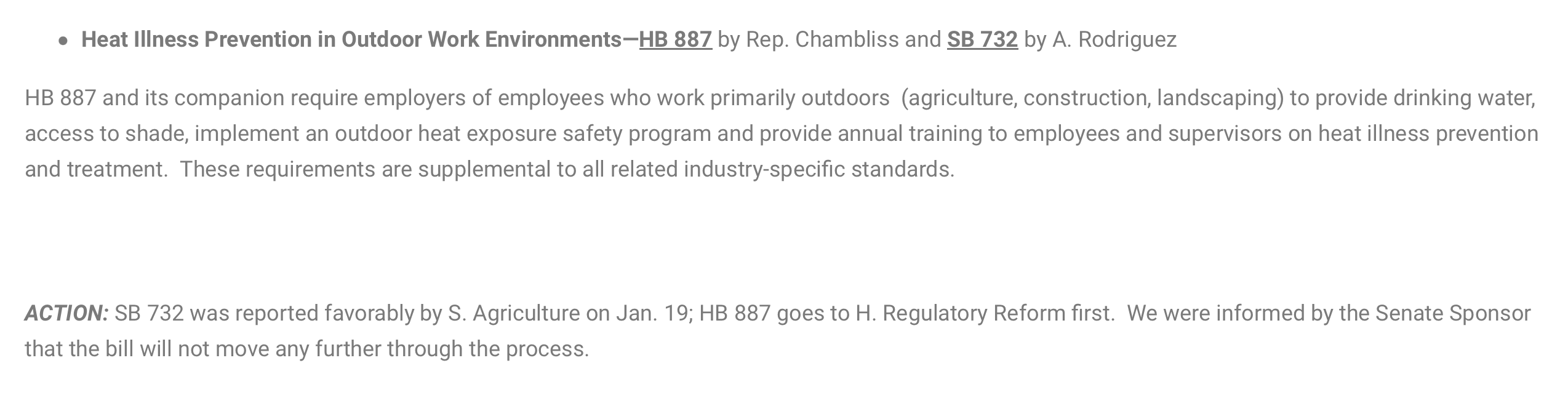 Workers tried again in 2023. Their heat-safety legislation was filed as Senate Bill 706 and House Bill 903. But legislative leaders would not allow the bill to move, and it died without a hearing.