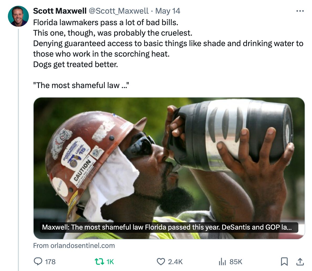This is a law that quite literally stops communities from ensuring that workers toiling away in that heat have access to water and shade. As Orlando Sentinel columnist Scott Maxwell wrote recently, most people would expect no less for dogs.