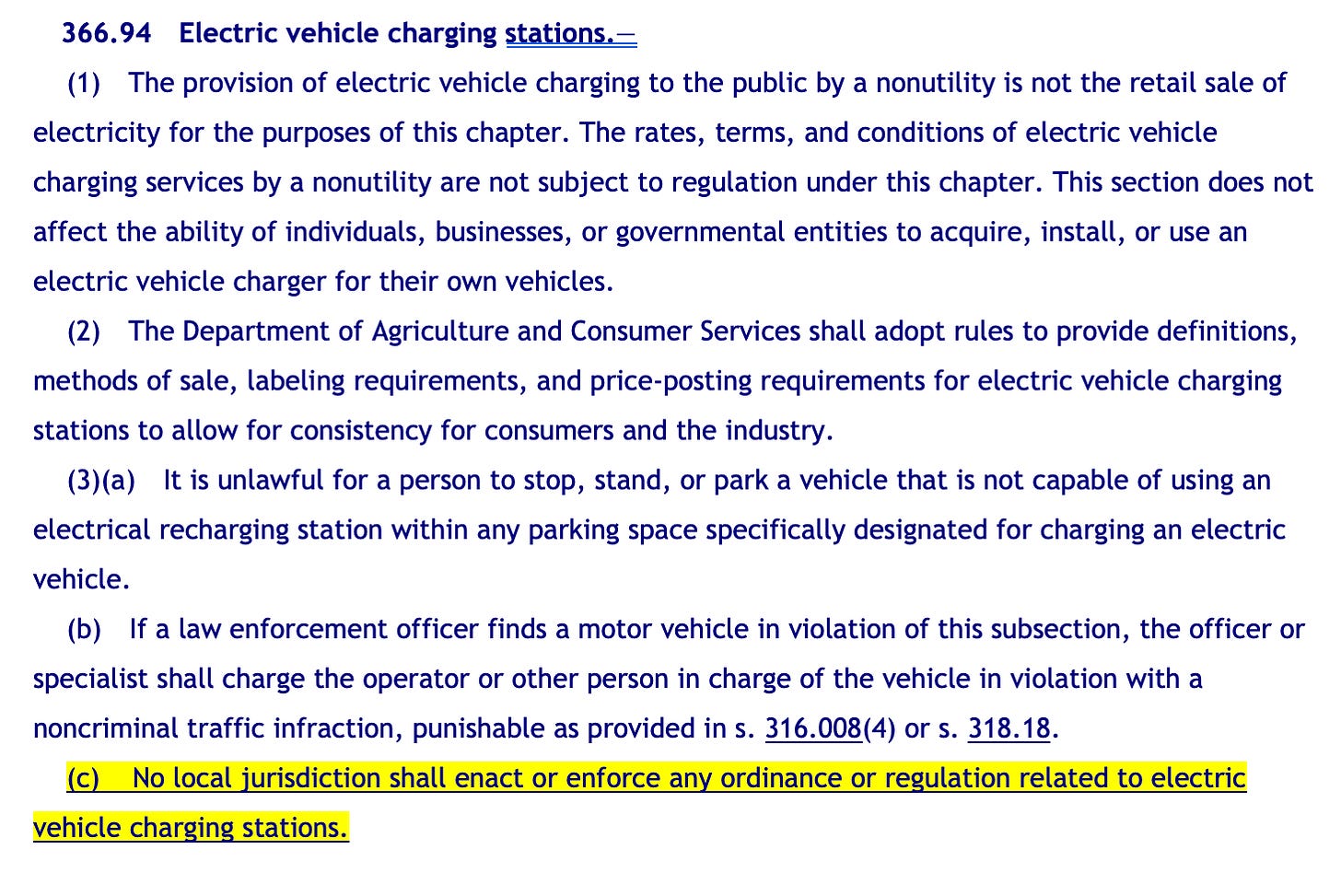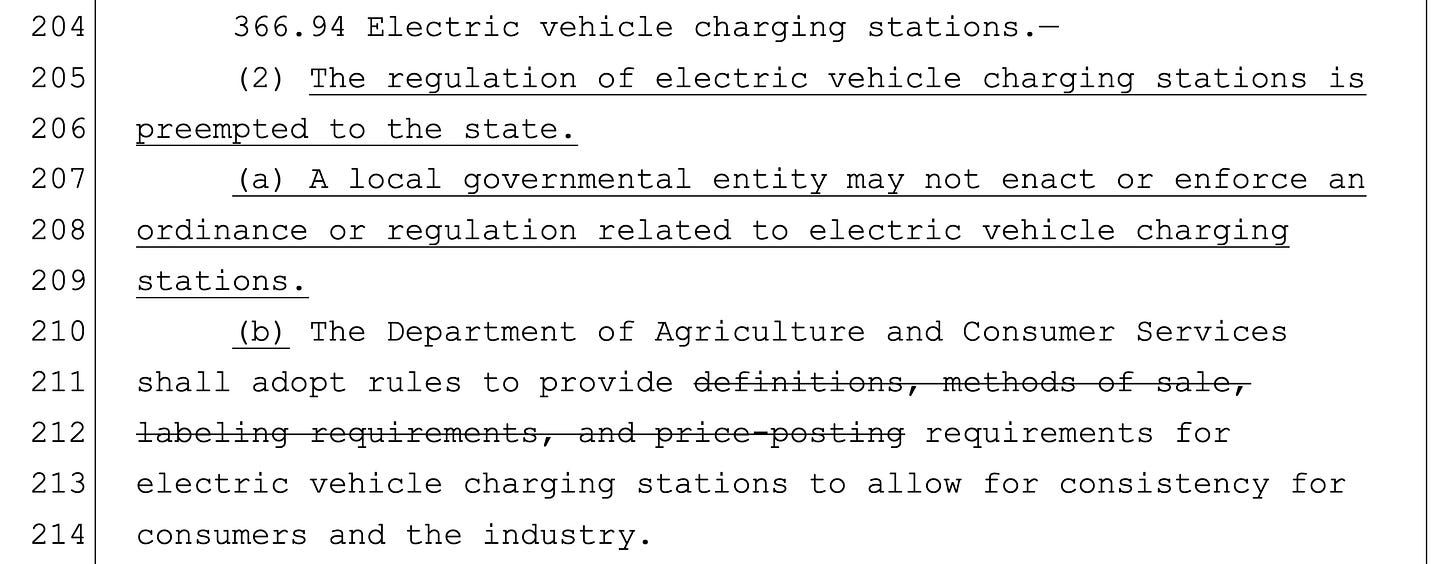 Publix’s plan to stop local governments from regulating EV charging stations was never added to Payne’s energy legislation. But Floridas’s Republican-controlled Legislature passed a nearly identical provision as part of another bill: Senate Bill 1084, a wide-ranging package of changes to various agriculture and consumer-safety laws.