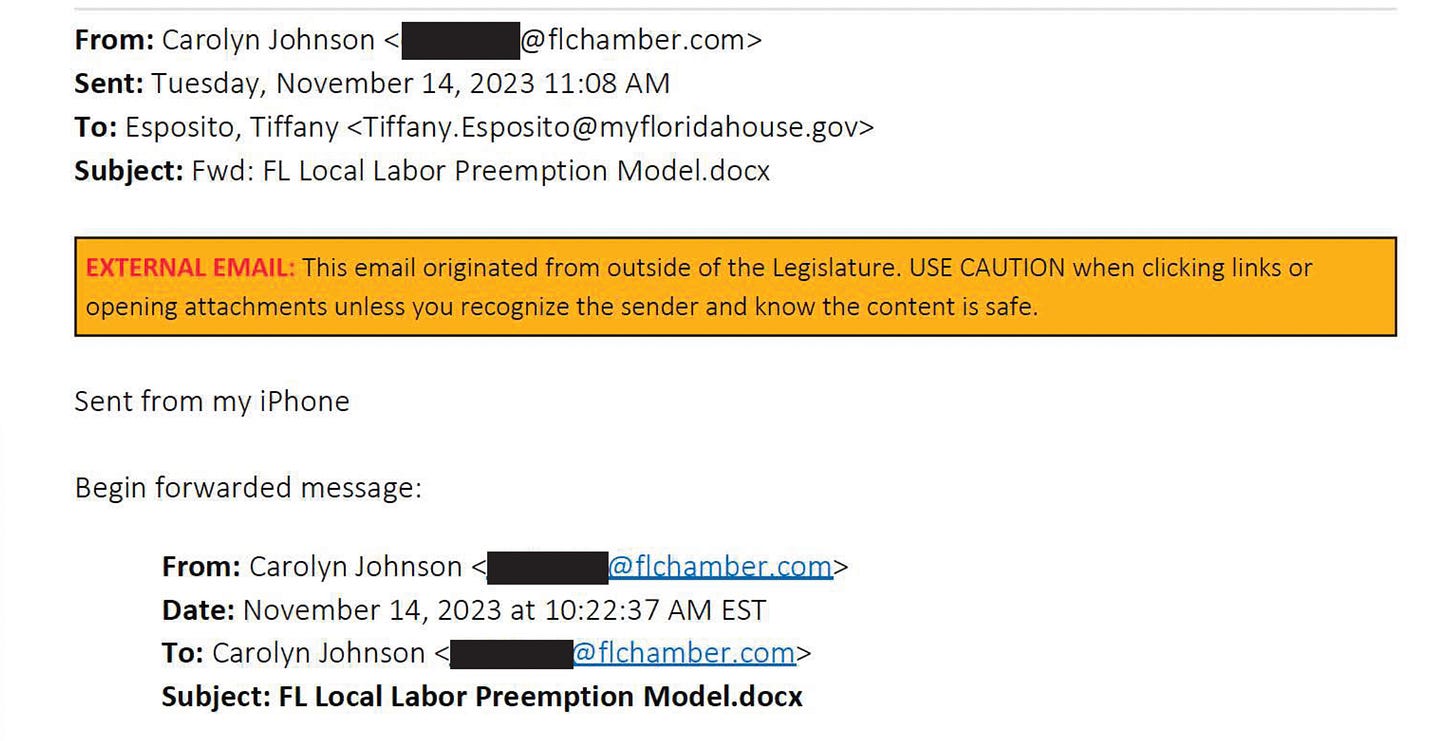 Records show this rewrite came from the Florida Chamber. Carolyn Johnson, a lobbyist for the chamber, emailed the proposed legislation to Rep. Tiffany Esposito, a Republican from Fort Myers who is sponsoring HB 433.