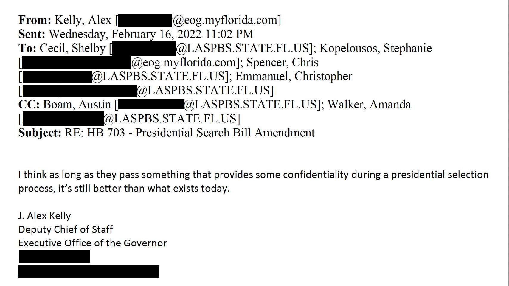 The Governor’s Office was closely tracking the legislation. A staffer immediately flagged the amendment for some of DeSantis’ senior-most aides — including his legislative affairs director, his budget director, and his deputy chief of staff in charge of education policy. The deputy chief of staff, Alex Kelly, advised the group they should accept the compromise.
