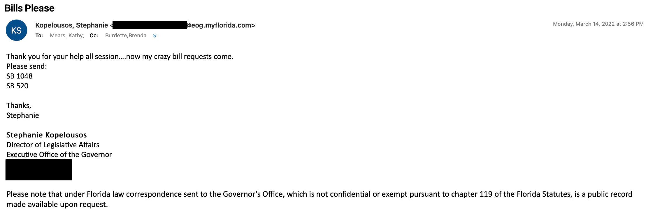 Immediately after the 2022 session ended — only about an hour after DeSantis concluded a post-session press conference in the Capitol rotunda — DeSantis legislative affairs director Stephanie Kopelousos emailed the chief of staff in the Florida Senate and asked to have the presidential bill search sent to the governor.