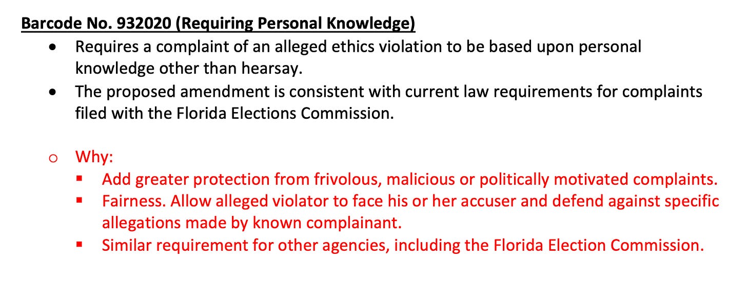 And when the Senate first unveiled its plans to add the “personal knowledge” requirement to Senate Bill 7014, Senate staffers prepared an internal document explaining the rationale for the change. In that document, which was obtained in a public records request, the Senate said the change was needed for three reasons: To protect against politically motivated complaints; to ensure fairness for the accused; and to align with similar rules at agencies like the Florida Elections Commission.