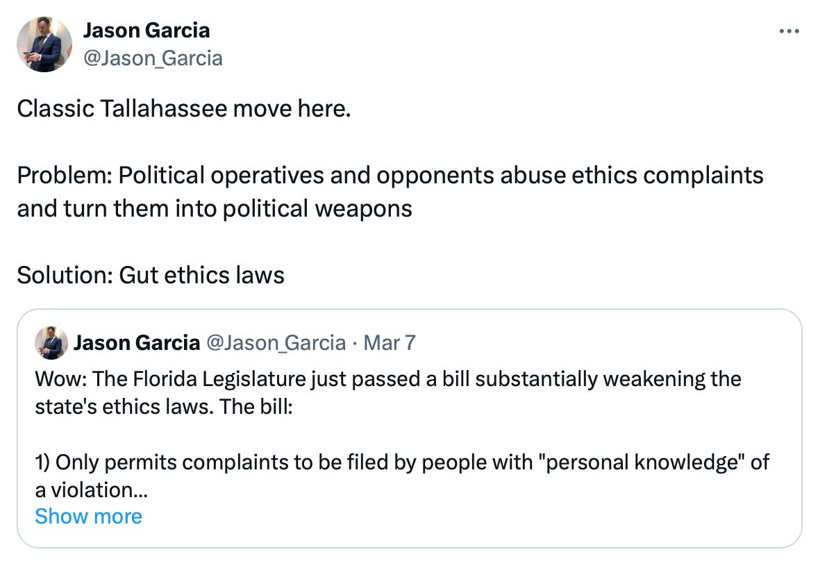 Now, the Governor’s Office and Senate are not wrong when they say that ethics complaints in Florida are often weaponized for political purposes.