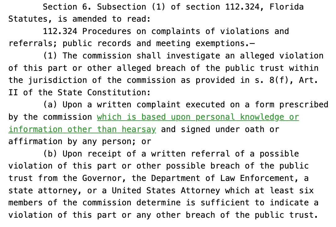 Senate Bill 7014 makes numerous changes to Florida’s ethics laws, most of which took effect the moment DeSantis signed the bill. One of the most consequential of those changes will prevent the Florida Commission on Ethics from acting on an ethics complaint unless the person filing it has “personal knowledge or information other than hearsay” about the alleged ethics violation.