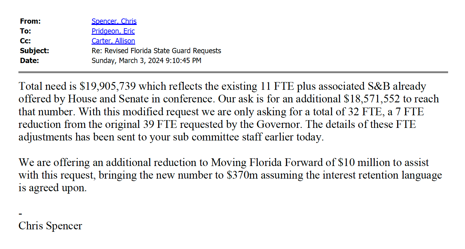 “We are offering an additional reduction to Moving Florida Forward of $10 million to assist with this request,” Chris Spencer, DeSantis’ director of policy and budget, wrote in a March 3 email to senior staffers in the Florida House of Representatives.