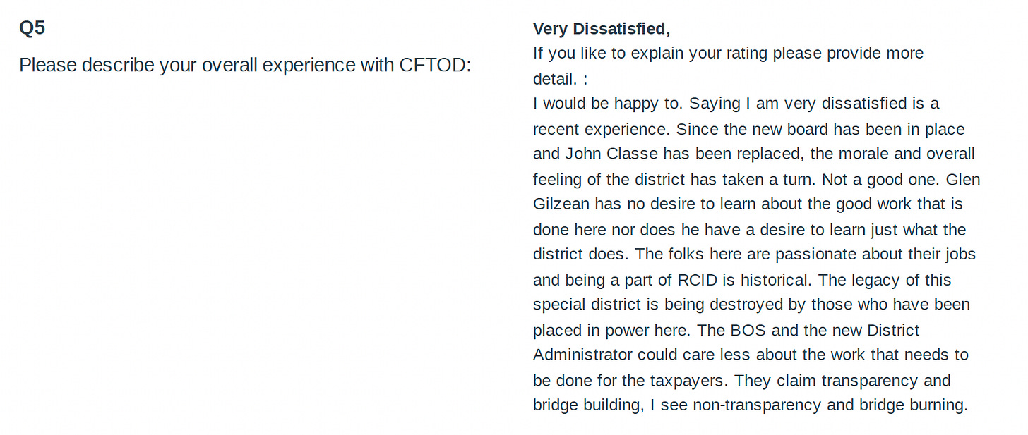 “The legacy of this special district is being destroyed by those who have been placed in power here,” wrote a former executive assistant. “The BOS [Board of Supervisors] and the new District Administrator could care less about the work that needs to be done for the taxpayers. They claim transparency and bridge building, I see non-transparency and bridge burning.”