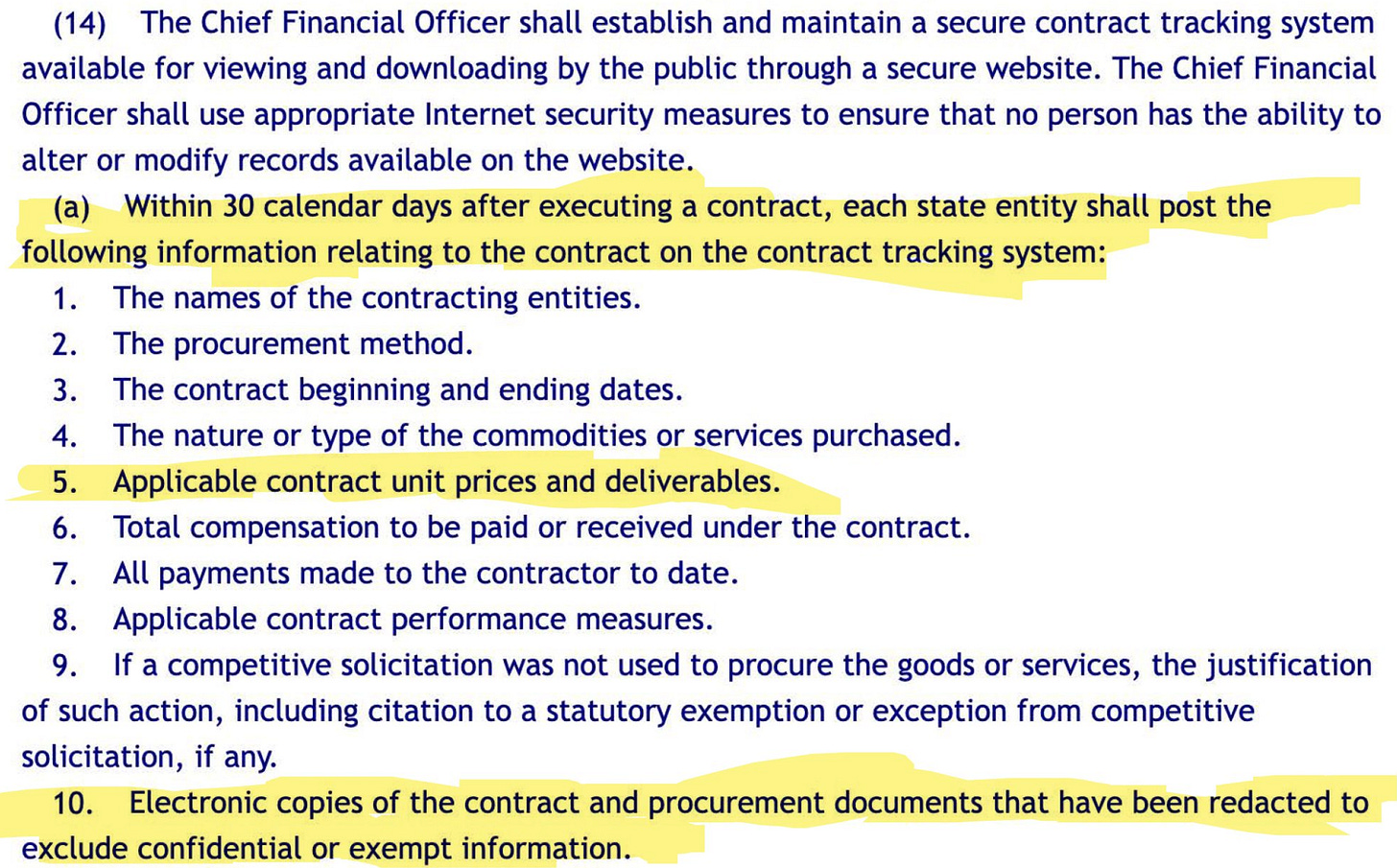 First, Florida is required by law to post certain information to this transparency database. That mandatory information includes both “electronic copies of the contract and procurement documents" and the “applicable contract unit prices and deliverables.”