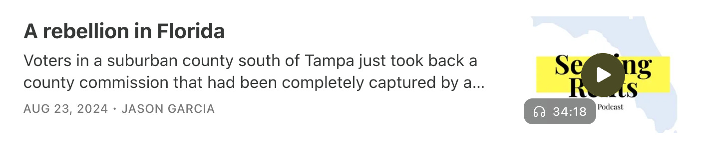 This is Seeking Rents, a newsletter and podcast devoted to producing original journalism — and lifting up the work of others — about Florida politics, with an emphasis on the ways that big businesses and other special interests influence public policy in the state. Seeking Rents is produced by veteran investigative journalist Jason Garcia, and it is free to all. But please consider a voluntary paid subscription, if you can afford one, to help support our work. And check out our video channel, too.