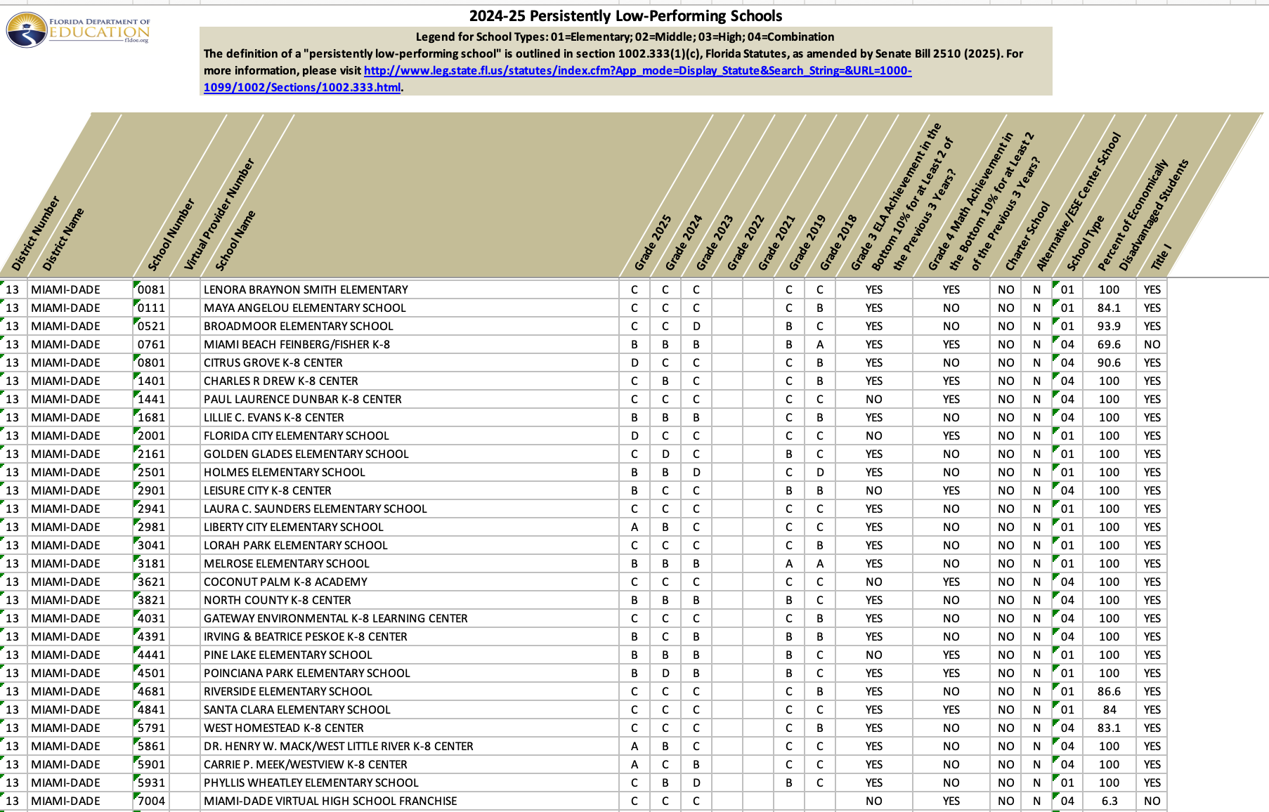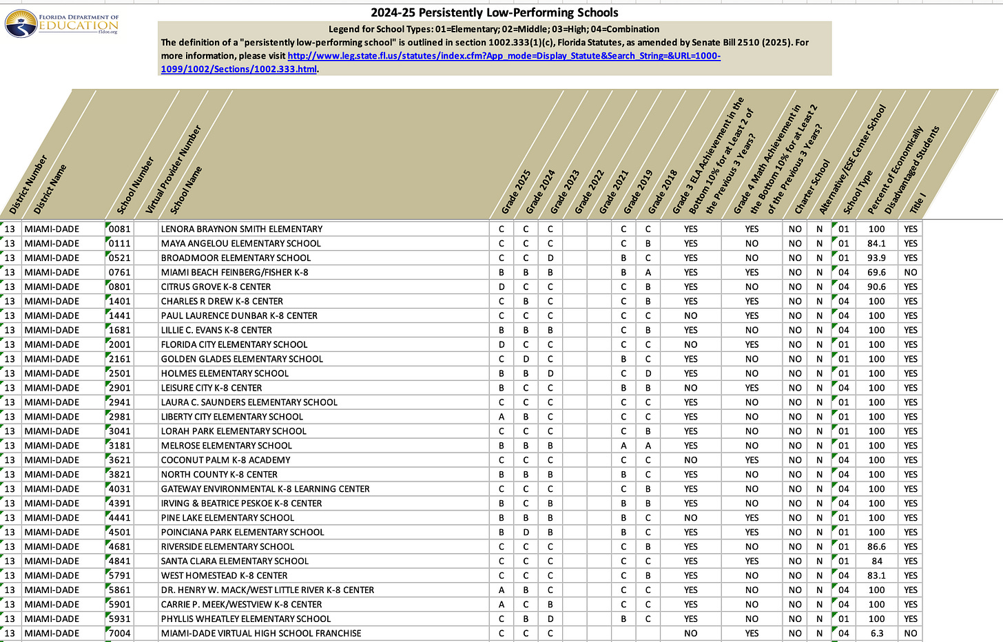 Miami-Dade County, for instance, had no “persistently low performing” schools last year, before Success Academy and Ken Griffin lobbied to change the law. The county now has 29 such schools — including three that are simultaneously rated as “A” schools and nine rated as “B” schools under Florida’s public school-grading system.